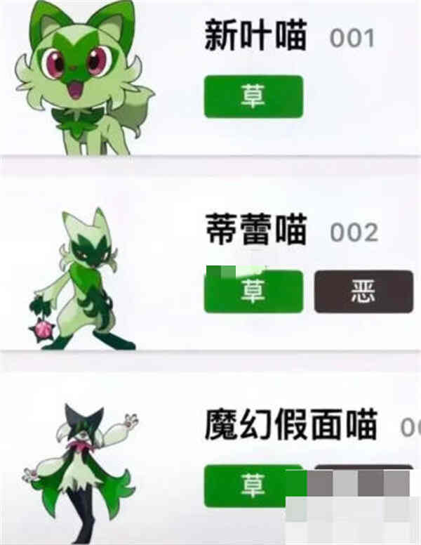 1:新叶猫,进化形态是新叶猫,蒂蕾喵,魔幻假面喵,这个形态还是非常的好看的,但是属性比较一般草加恶四倍弱虫;