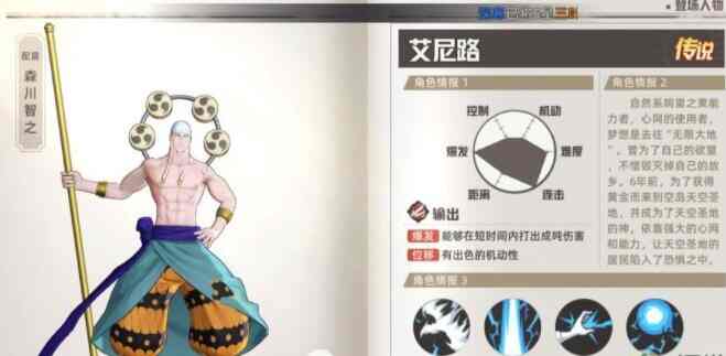 4、评价:艾尼路适合爆发性输出,技能释放时间很快,所以会有一定的技能真空期,在持续性输出上肯定是比不了艾斯的灼烧流的,优点是爆发伤害高变身后大奥伤害非常高,缺点是对能量需求大,技能有一定的真空期。