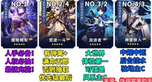 1、抽取建议:本次的散兵和雷神是建议玩家都抽的,但如果只能选一个,这里小编建议优先选择雷电将军。