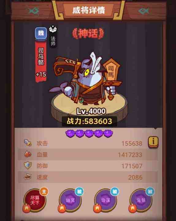 司马懿:司马懿是魏国神话品质的咸将,场上位置是法师,随着回合数的增加和友军技能的释放,司马懿的战力会越来越高。