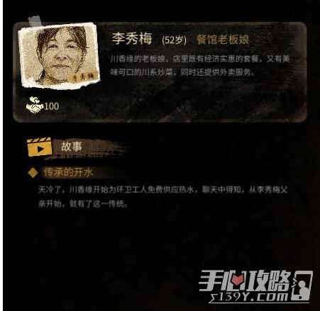 在游戏中,李秀梅是川香缘老板娘,好感到80到店里对话会触发支线剧情开水。
