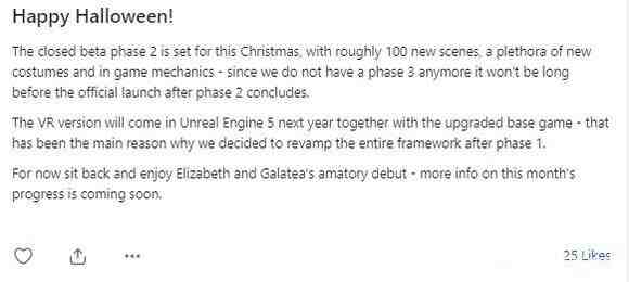 2、虚拟现实版本明年将与升级的基本游戏一起出现在“虚拟引擎5”中。这也是我们决定在第一阶段之后修改整个框架的主要原因。现在,坐下来欣赏伊丽莎白和加拉塔的爱情处子秀