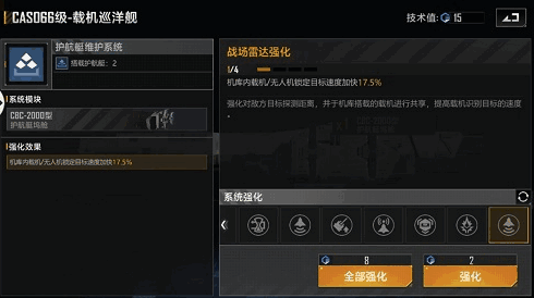 3、飞机分为护航艇、战机和无人机,其中护航艇脱离母舰可长时间作战,所以先点冷却速度的意义不大,无人机是脱离母舰后作战时间最短的。