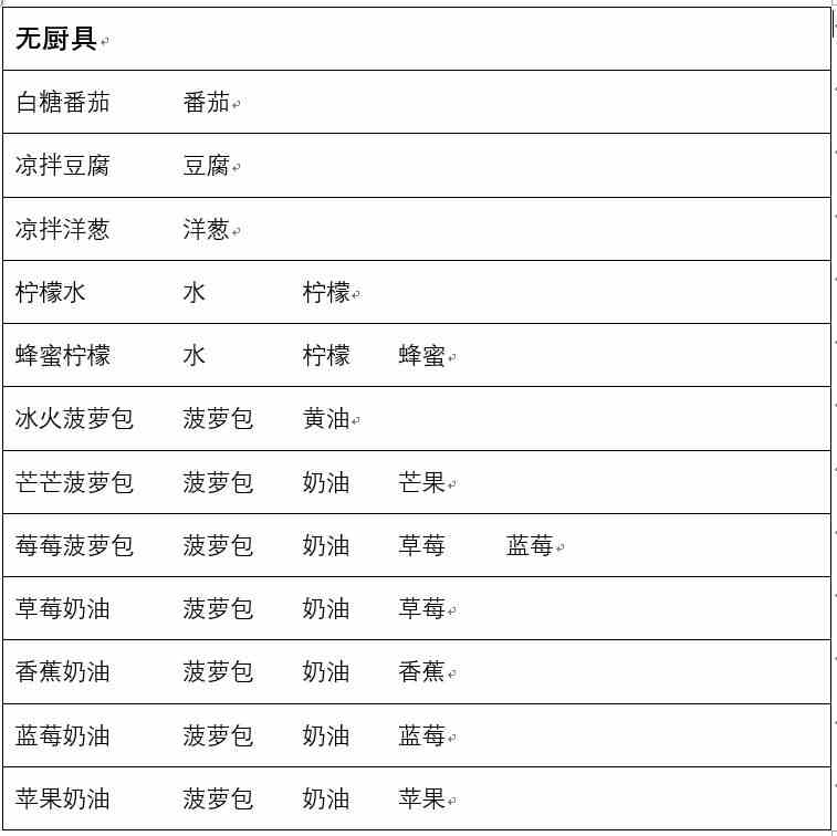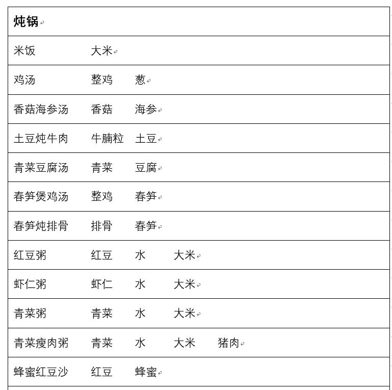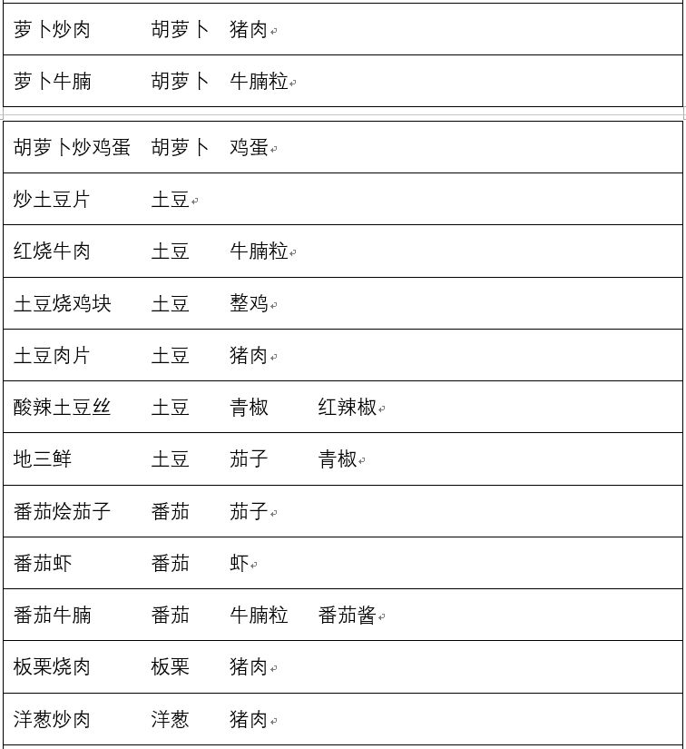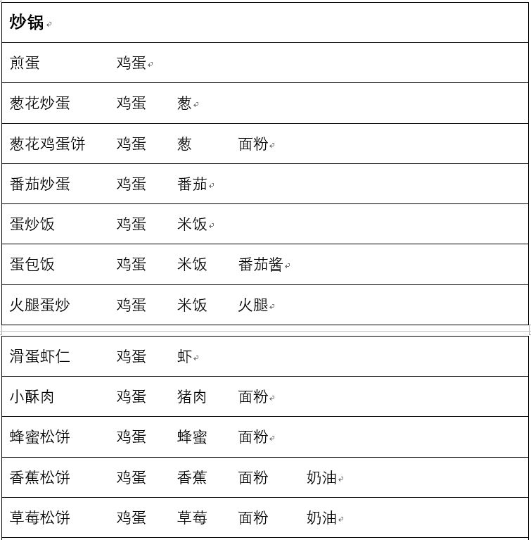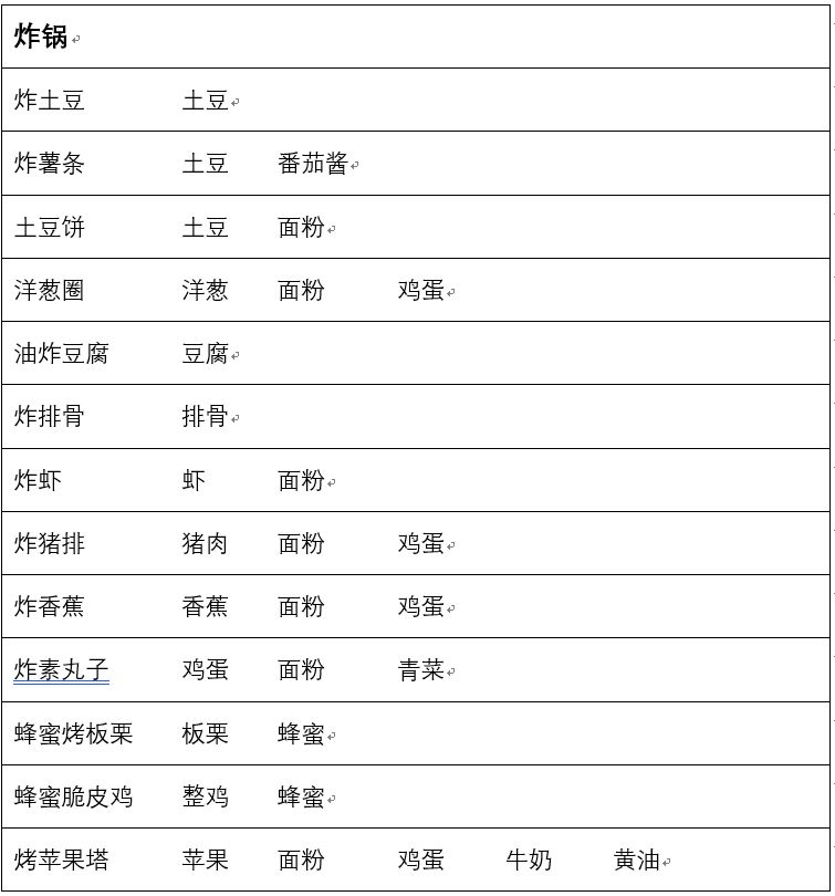 番茄虾,香肠炒蛋,青椒炒蛋,红辣椒炒肉,萝卜牛腩,春笋烧排骨,板栗烧肉,青菜粥,春笋煲鸡汤,春笋炖排骨,洋葱炒蛋,葱烧海参,土豆炖牛肉,海参蒸蛋,凉拌洋葱,青菜瘦肉粥,香菇海参汤,青菜豆腐汤,油炸豆腐,蜂蜜脆皮鸡,洋葱萝卜饼,莓莓松饼,香蕉松饼,洋葱圈,炸香蕉,炸猪排,小酥肉,口水鸡