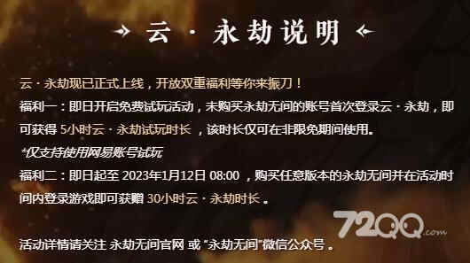 福利二:即日起至 2023年1月12日 08:00 ,购买任意版本的永劫无间并在活动时间内登录游戏即可获赠30小时云·永劫时长。
