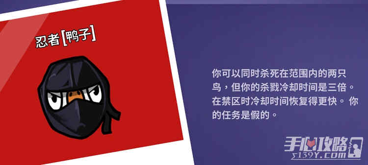 Goose Goose Duck鹅鸭杀忍者是鸭子阵营角色,忍者技能可以同时杀死在范围内的两只鸟,但是冷却时间三倍,在禁区冷却时间恢复加快