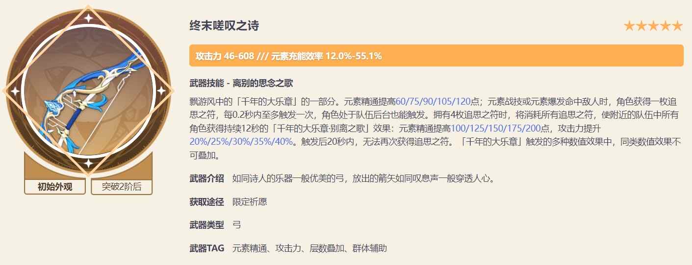 1、有效的提高高元素充能为全队伍增加攻击以及元素方面的经精通效果。