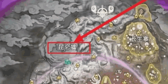 4、将地图打开后并找到昆仑墟的位置并选择。