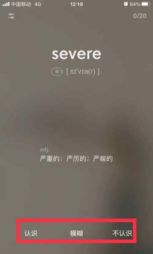 2、跳转的界面中,可以看到认识、模糊、不认识三个选项,如果熟悉单词,那么点击“认识”、如果有一点印象而已,那么点击“模糊”,否则点击“不认识”