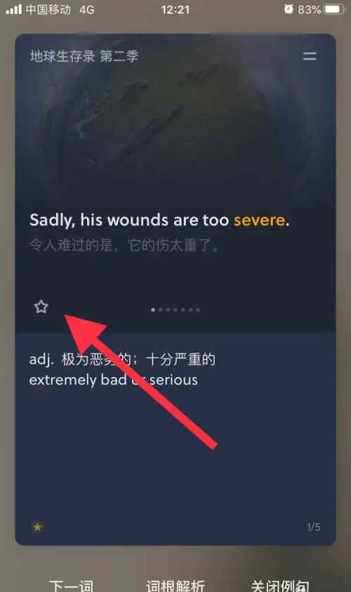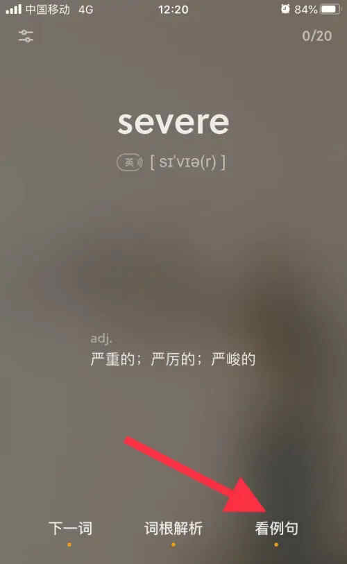 3、如果点击了“不认识”,那么进入如下界面,可以点击“看例句”查看对应单词的例句