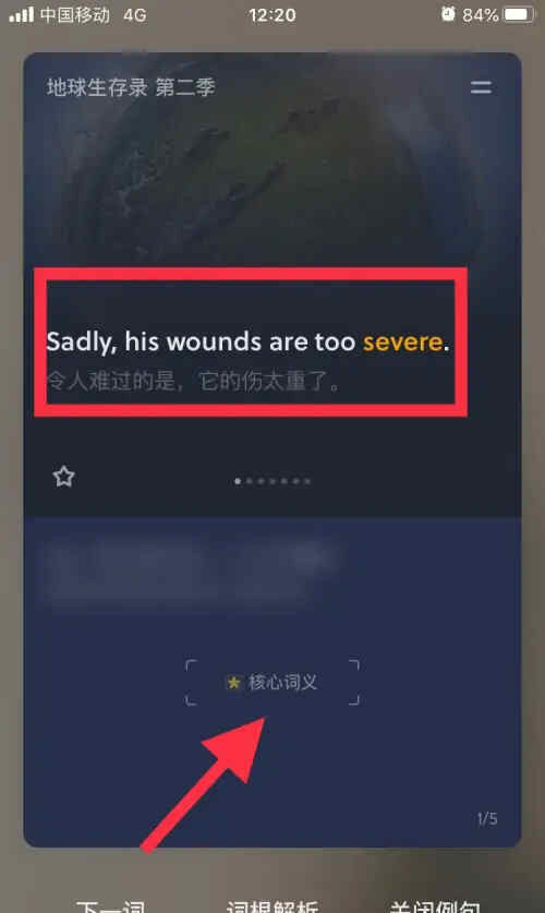 4、进入例句界面,根据例子来猜测单词的意思,然后点击“核心词义”可以查看单词意思