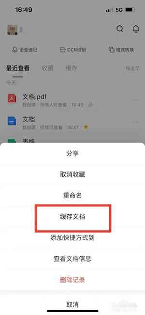 2、选择缓存文档选项。