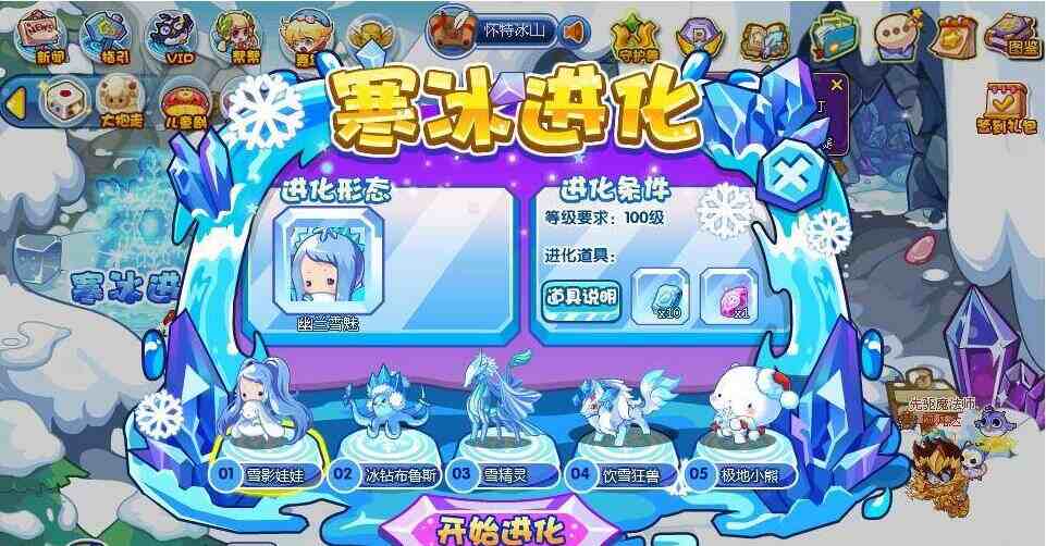 找到寒冰进化即可.不是所有的冰系宠物都可以超进化,可以超进化的冰系宠物有雪影娃娃、冰钻布鲁斯、雪精灵、饮雪狂兽和极地小熊等等。