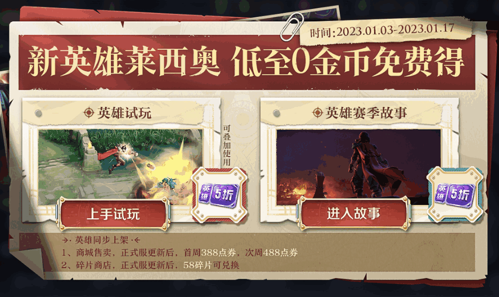 1、通过英雄试玩和英雄赛季故事系统,得2张英雄金币五折卡,叠加使用后0金币免费得英雄(一张五折卡可抵扣莱西奥半价购买金币);