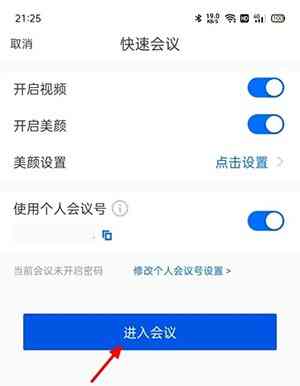 2、在快手会议页面,开启使用个人会议号。