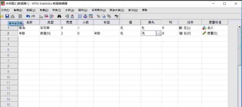 4、点击变量视图,即可出现如下界面。我们可以看到变量视图中,第一个变量可以设置的包括名称、类型、宽度、小数、标签、和值等设置类型;