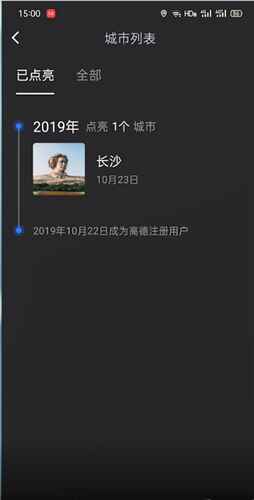 4、就可以看到你所在的城市被点亮,点亮城市的条件是只有你在到达该城市时,登录并使用过高德地图才能够点亮城市,