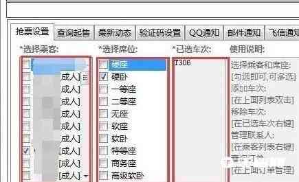 3、通过软件主页的左下角,选择乘客信息、席位以及车次信息。(同时还可以设置QQ通知、邮件通知或者是飞信通知)。