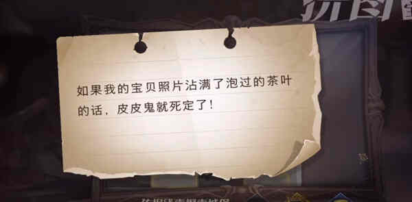 1:首先游戏中提供的线索是如果我的宝贝照片沾满了泡过的茶叶的话,皮皮鬼就死定了;