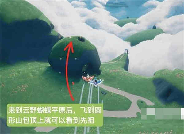 1:首先我们来到云野蝴蝶平原后面,我们飞到圆形的山包顶上,如图所示;