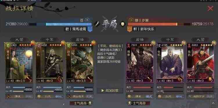 队伍框架就是比较常见的大乔弓诸葛严颜的框架,只是把荀换成了大乔,但是这一换,就把大黄严开荒强但转型不强,老是互相刮痧的缺点弥补了。现版本垒实桃园开荒盛行,张机独霸前期战场,肉队横行,类似这样的互刮战报多如牛毛!急需荀这位禁疗大神出来打破僵局!而且由于士气的原因,30%发动率的荀开荒从不可行变成了可行,所以第一队出荀也从不可能变成了可能!