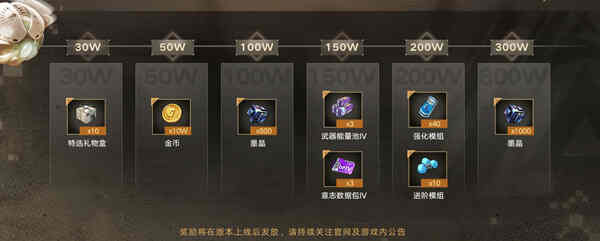 这次预约的奖励还是非常的丰富的,十个特选礼物盒,还有十万的金币,五百个墨晶,三个武器能量池,三个意志数据包,四十个强化模组,十个进阶模组,一千个墨晶,这些都是需要达到对应的预约量才可以的,分别是30w,50w,100w,150w,200w,300w。