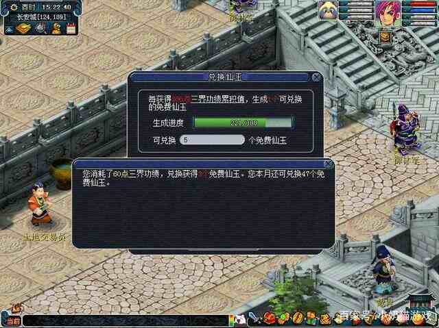 很多玩家可能不知道这个功能,玩家每积累了300点三界功绩,就可以获得免费换取一个仙玉的机会。兑换的NPC在长安城120.190处,这里要说的是,每个月只能兑换50个仙玉,在每月的1号刷新兑换时间,每兑换一个仙玉需要消耗20点三界功绩,兑换50也就是消耗1000点三界功绩,这个算是消耗很快的方法了。