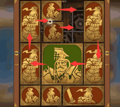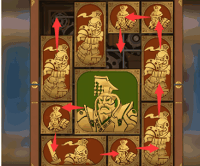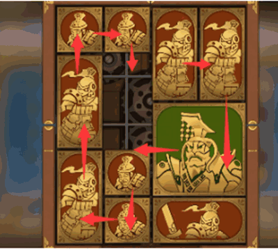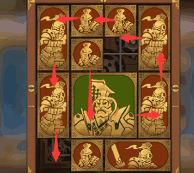 5、下一步除了最下方的图形以外,其他所有的图形全部逆时针旋转一圈,将军向右移动,其上方的正方形向下移动。