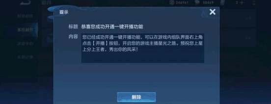 在昨日有很多玩家在游戏中被提示:恭喜您成功的开通一键开播功能,这个其实是快捷开直播的功能,在s30新赛季中的一个快捷功能,现在在网络上直播游戏的玩家是很多的,这个可以让玩家快速开启自己的主播星光之路,不开直播的玩家也不用在意,不影响游戏玩法,