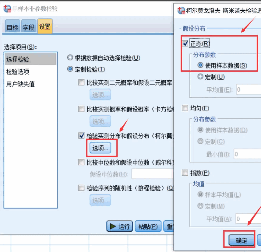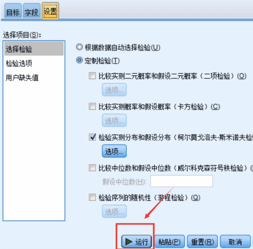 4、如下图再点击“设置-定制检验-检验实测分布和假设分布(K-S)”