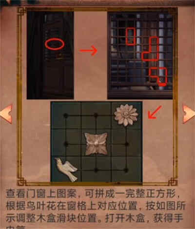 1:首先我们在地上拾取鸟滑块,然后我们点击桌子上的盒子,把鸟滑块放进去,接着我们点击大门,然后就需要进行解谜了,我们把俄罗斯方块拼接在一起就可以获得手电筒道具了;