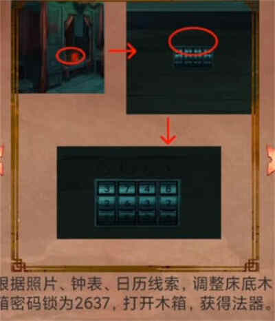 3:再然后我们需要根据照片,钟表,日历的线索知道床底木箱的密码是2637;