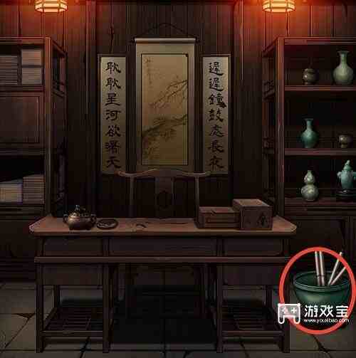 16、回到房间将水倒入桌上的砚台,再将墨条放入其中得到墨水,用毛笔蘸墨,点击画卷,根据卷轴中的线索用毛笔连线,得到八卦图