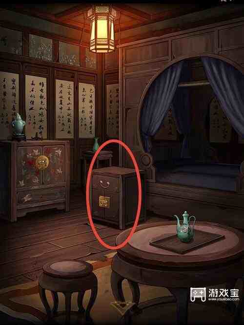 18、进入卧室,点击红圈处箱子,根据书房中卷轴线索打开箱子,得到扇面和床上的线索