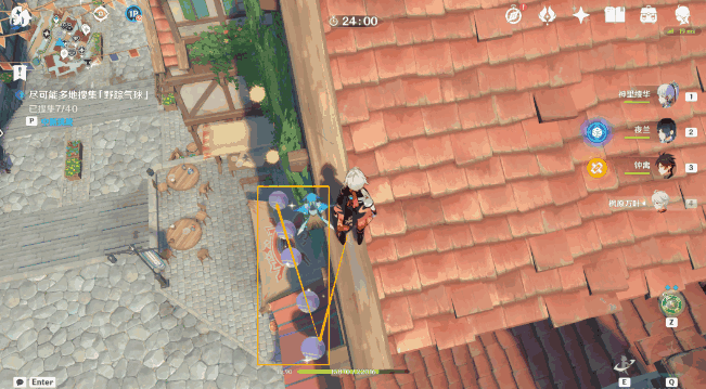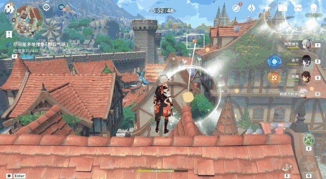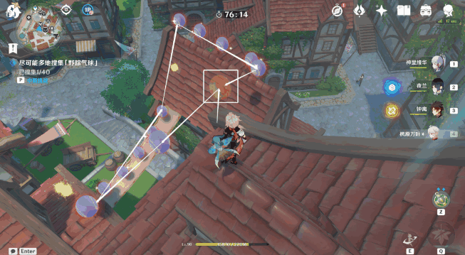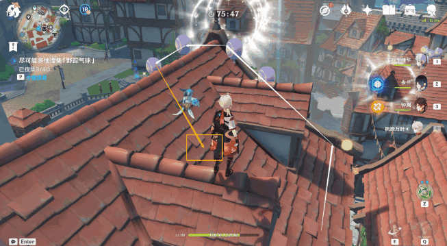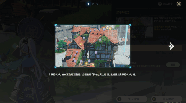 气球被布置在屋顶各处,利用护佑爬上屋顶,搜集气球吧。