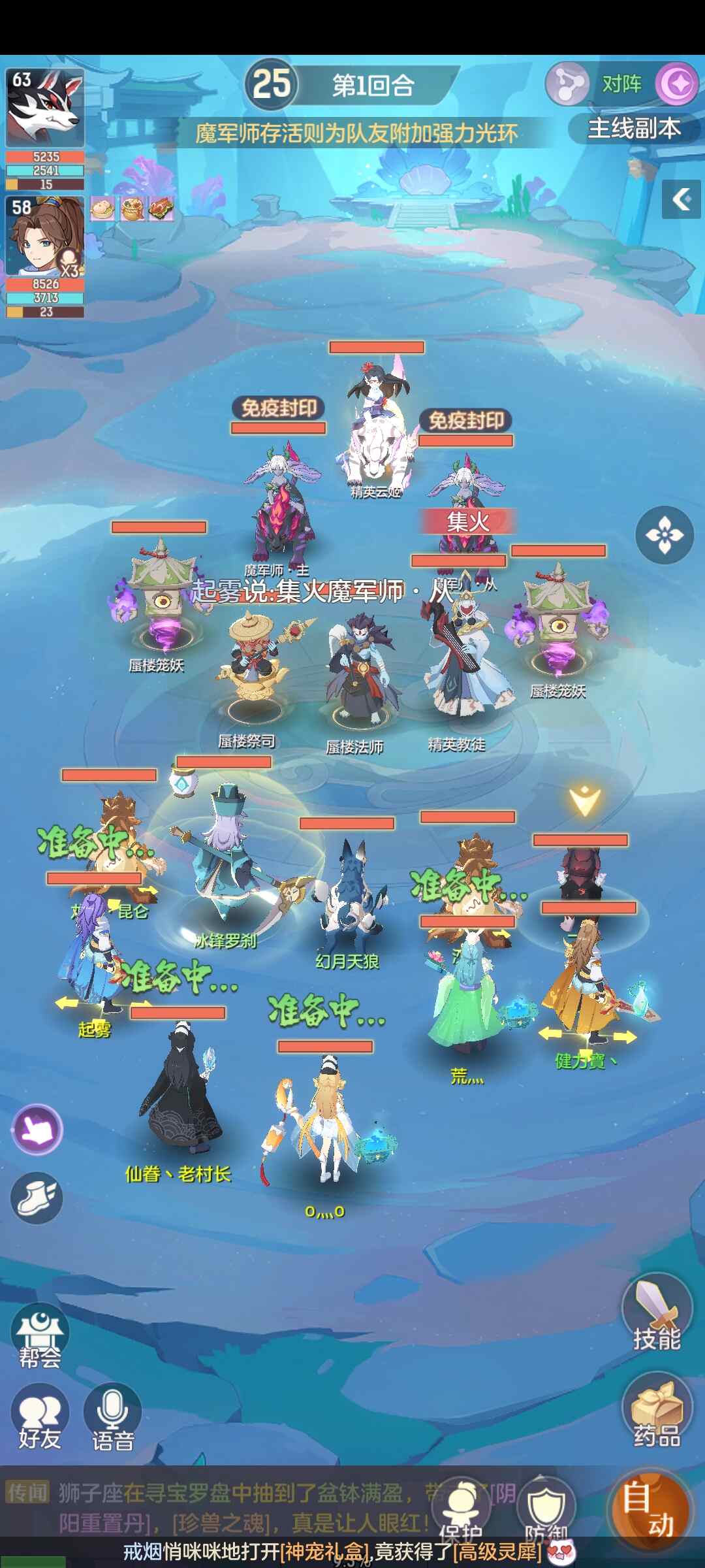 ·打法:第一回合封控制对面教徒,奶妈可以选择加伤害或者金钟罩控制对面祭司,集火1魔军师·主(杀了它就不会给主怪加连击buff,这点尤其重要,不先秒它可能会面临灭队),集火2魔军师·从(杀了它就不会给少血的怪加盾啦),集火3精英云姬。