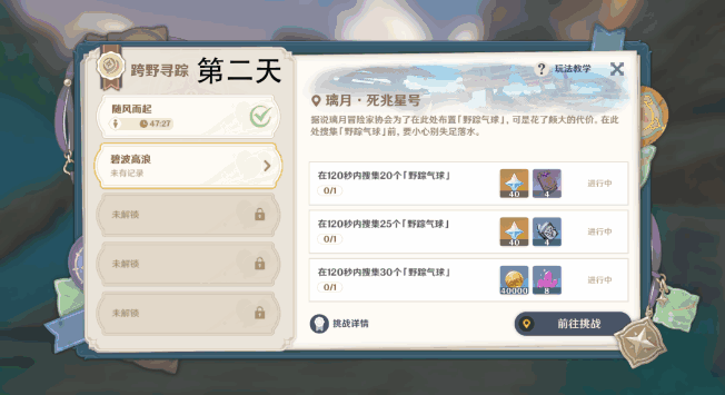 游家吧小编分享了有关原神跨野寻踪第二天攻略:需要旅行者们在不同的越野路线中去搜集更多的[野踪气球],气球越多,奖励越多,下面就来看看相关的内容信息吧。