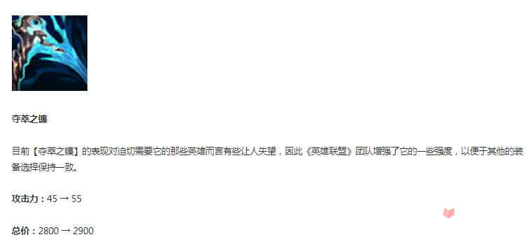 目前 夺萃之镰 的表现对迫切需要它的那些英雄而言有些让人失望,因此英雄联盟团队增强了它的一些强度,以便于其他的装备选择保持一致。