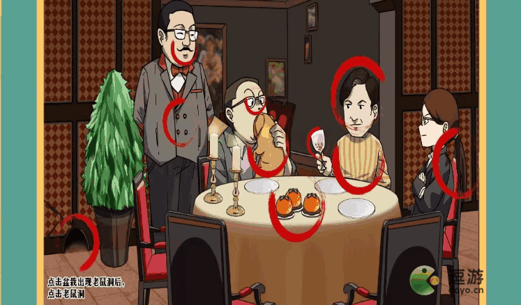 - 点击盆栽会出现老鼠洞,找到老鼠,左边的人胡子是虎,纽扣是牛