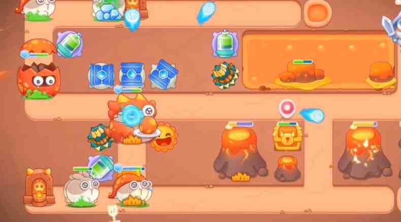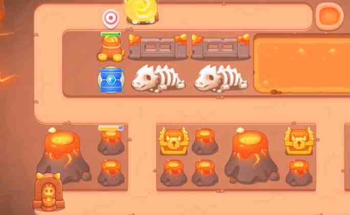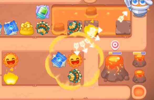 - 宝箱清理完之后,在位置上放置太阳,附近放上箭塔和桶子,然后锁定右边的火山。