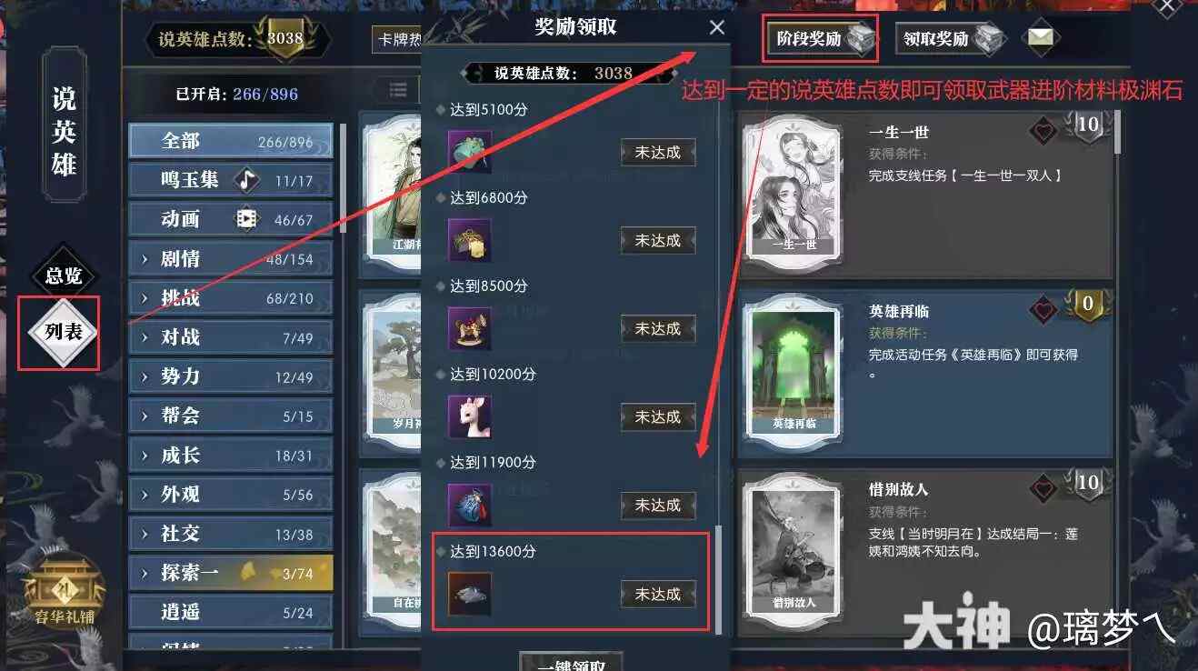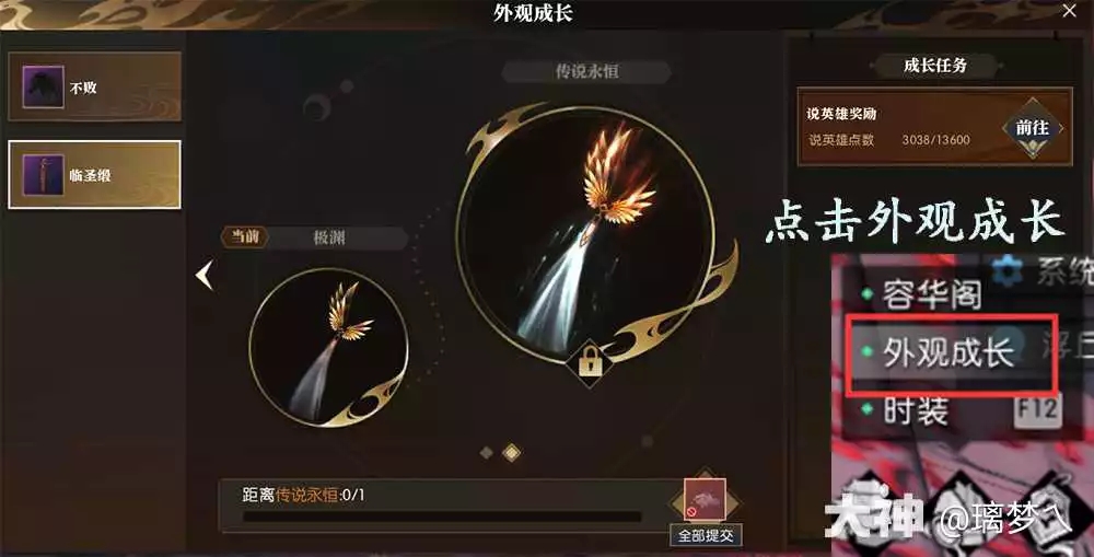 - 武器外观进阶---说英雄点达到13600时可以领取进阶材料 极渊石 ,进阶后即可获得 传说永恒 武器外观!