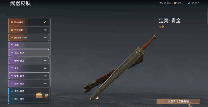永劫无间长剑皮肤定秦青金获得方法定秦青金:开启奇珍宝箱获得
