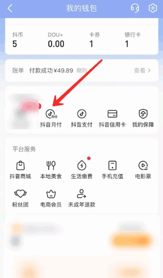 - 进入我的钱包之后,上方位置会有一个 抖音月付 的功能,用户点击;
