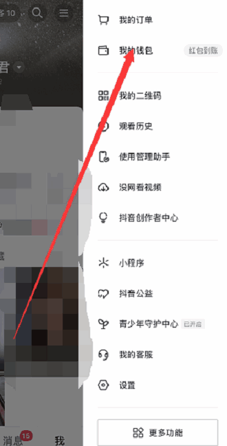 - 进入抖音app之后,点击右下角的 我 ,然后点击右上角的展开建,里面会有 我的钱包 ;