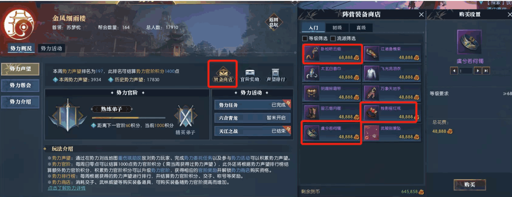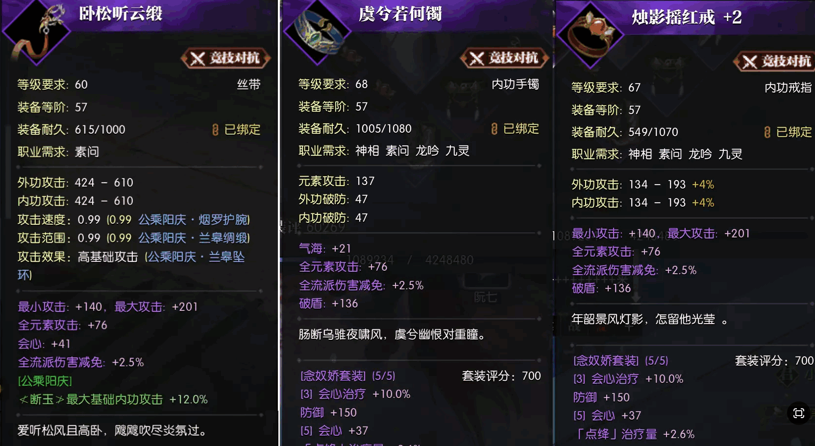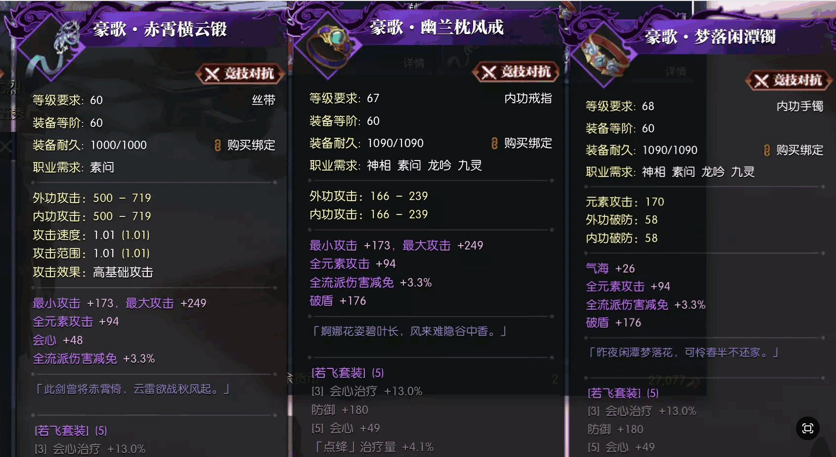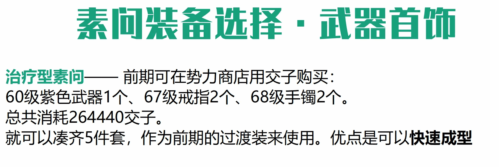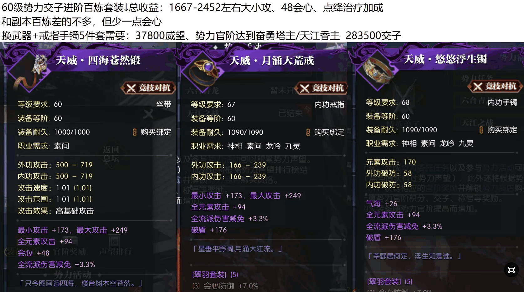 60级紫武器首饰:势力-装备商店 交子直接买武器戒指手镯5件套。成型快,收益高,比副本治疗收益大很多,看图有详细说明