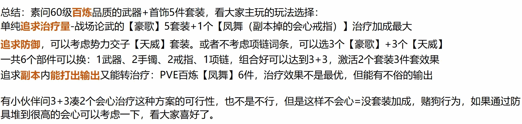 ①治疗效果最好: 豪歌 套装+1副本掉落会心词条 凤舞 戒指获取途径:兑换→武林威望-战场论武商店-初级(刚刚发的时候有小伙伴问双会心治疗加成的3+3,我感觉也不是不行,但是短板大,没会心的时候=没套装效果,如果通过防具堆到很高的会心率可以考虑,属于赌狗行为,自己想玩个爽的看个人喜好了)