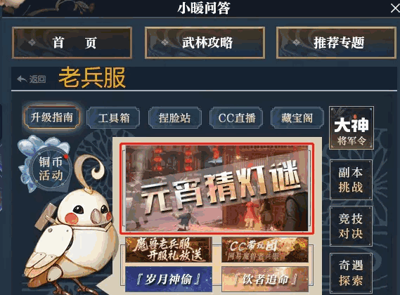 玩法入口:主界面小暖进入-元宵猜灯谜(老兵服)主界面小暖进入-话团圆(正式服)玩法奖励:答对5题,可获得30天限时称号 话团圆 可参与服:正式服&老兵服均可