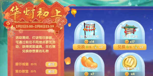 介绍:活动期间,灯谜每日刷新,可通过前往不同地点参加活动,获得奖励道具,在右侧兑换你想要的礼物。