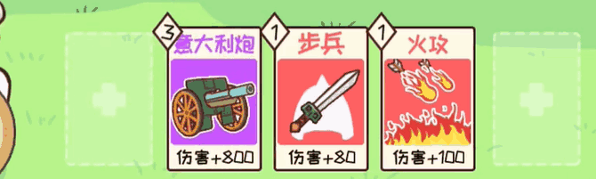 - 第五轮牌就又有可以合成意大利炮的牌,枪兵、马车、huog合成后打出便通关了。