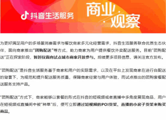 抖音表示,为更好满足用户的多场景消费需求与餐饮商家多元化经营需求,抖音生活服务联合优质生态伙伴,面向商家推出“团购配送”等方式,助力商家为用户提供餐饮外卖配送服务。目前“团购配送”正在探索阶段,暂时仅面向试点城市商家开放参与。